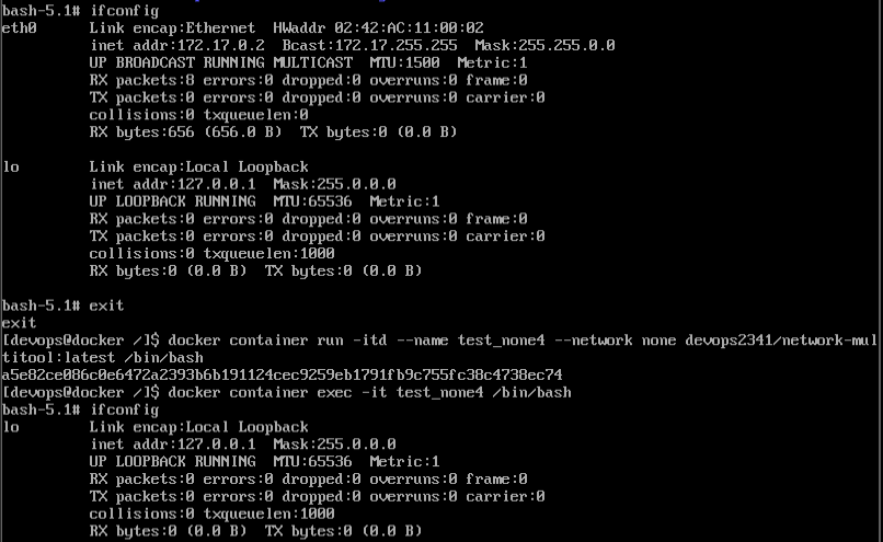 $ docker container run -d -t --network none --name test_none devops2341/network-multitool:latest (IP와 관련된 도구가 설치된 이미지)