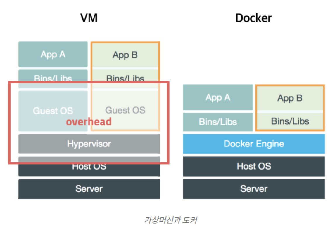 VM과 비교해보면, Guest OS가 필요없어지면서 오버헤드가 정말 많이 줄었다고도 볼 수 있지.